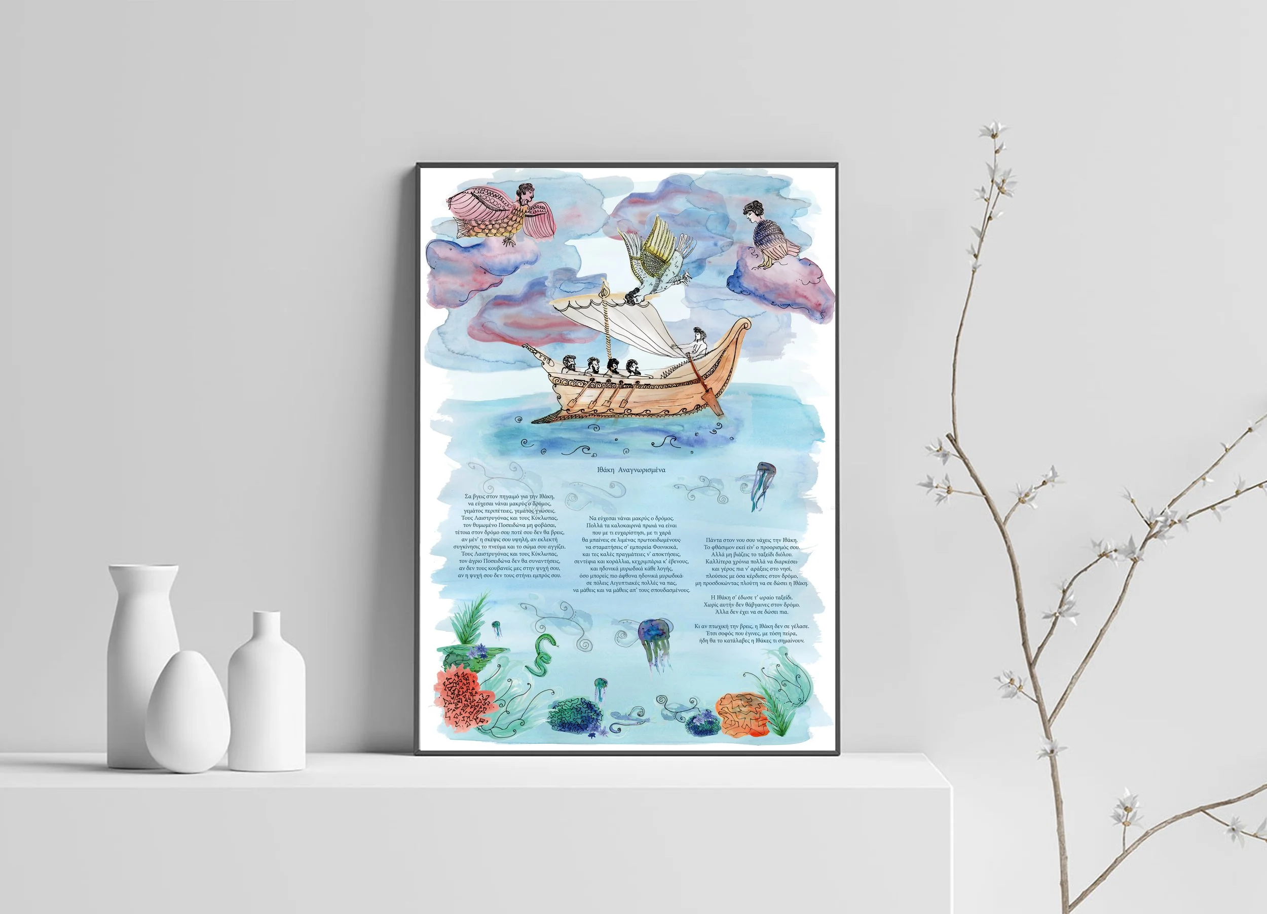 Ein illustriertes Poster, das die Heimkehr des Odysseus nach Ithaka in den Mittelpunkt stellt. Szenen aus der Odysee fügen sich zu einer visuellen Erzählung über Sehnsucht, Prüfung und Ankommen – liebevoll gestaltet mit Blick fürs Detail und die Symbolik des Mythos.
